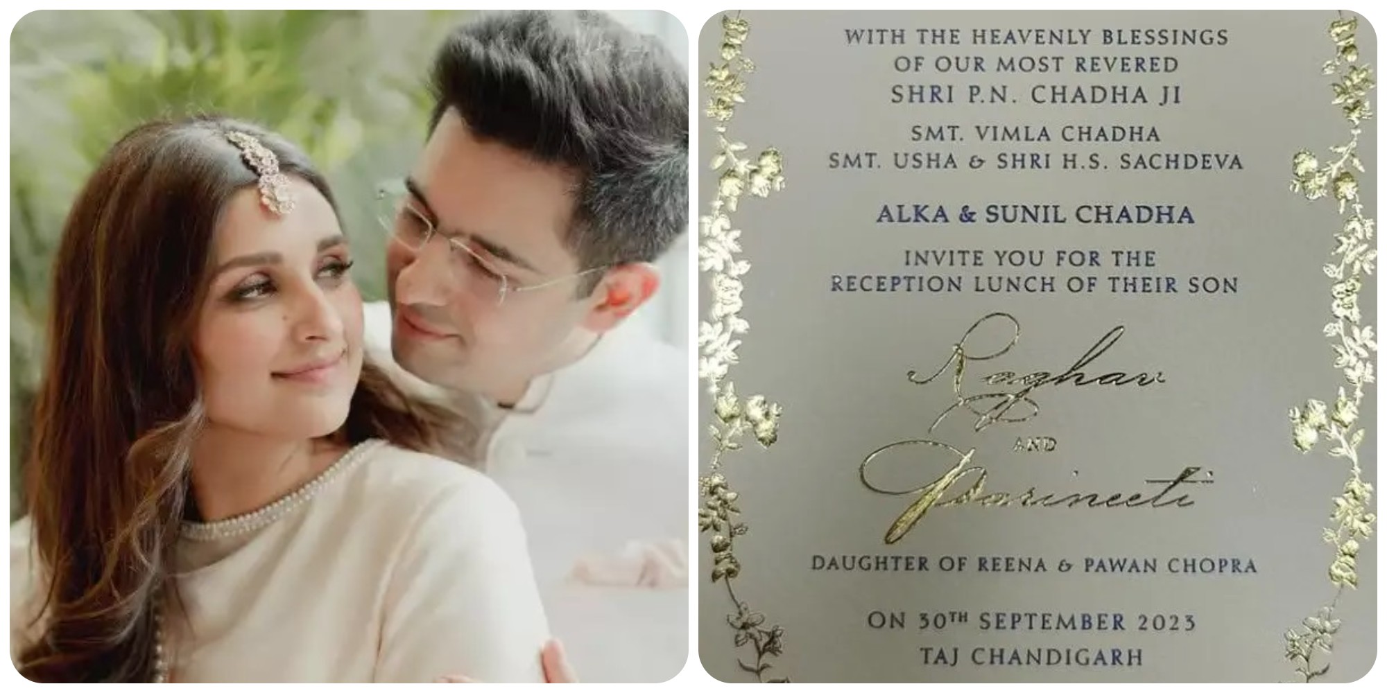 वायरल कार्ड के हिसाब से परिणीति और राघव का इसी महीने की 30 तारीख शादी को ग्रैंड वेडिंग reception चंडीगढ़ के ताज होटल में होने वाला है। कार्ड में लिखा है, 'आशीर्वाद के साथ श्री पीएन चड्ढा जी और श्रीमति विमला चड्ढा, श्रीमती उषा और श्री एच एस सचदेवा, अल्का और सुनील चड्ढा आपको अपने बेटे राघव और परिणीति के रिसेप्शन लंच के लिए इंवाइट करते हैं।' इसके साथ ही 30 सितंबर तारीख लिखी है, वहीं वेन्यू ताज चंडीगढ़ लिखा है।