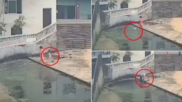 नाले में गिरते बच्चे को 60 साल के बुजुर्ग ने बचाया, देखें दिल दहलाने वाला वीडियो