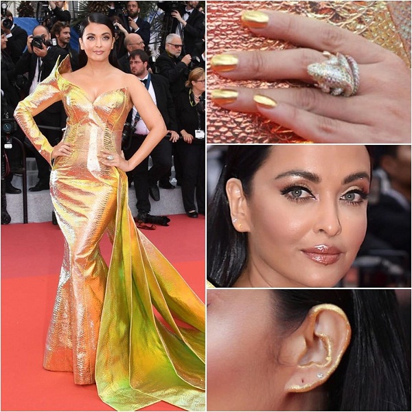 ऐश्वर्या ने Jean-Louis Sabaji का वन-शोल्डर गोल्डन मैटेलिक फिश-कट गाउन वियर किया। ऐश्वर्या का आउटफिट तो कमाल का था ही लेकिन आउटफिट से ज्यादा उनके ईयर मेकअप ने सबका ध्यान अपनी ओर खींचा। बिना ईयररिंग्स के ऐश्वर्या ने अपने कानों को मेकअप से हाईलाइट किया।