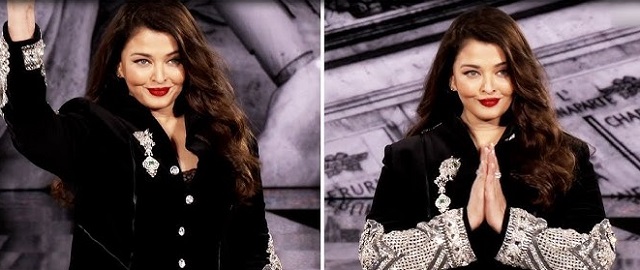 पेरिस फैशन वीक के दौरान ऐश्वर्या राय ने ब्लैक कलर की शेरवानी स्टाइल आउटफिट में रैंप वॉक किया। इस आउटफिट को फेमस डिजाइनर मनीष मल्होत्रा ने डिजाइन किया था। इसमें हीरों से जड़ी शानदार एम्ब्रॉयडरी की गई थी, जो ऐश्वर्या के रॉयल लुक को और भी ज्यादा निखार रही थी। उनका यह लुक पारंपरिक और मॉडर्न दोनों का परफेक्ट कॉम्बिनेशन था, जिससे उनके हर स्टेप पर स्पॉटलाइट उन्हीं पर टिकी रही।