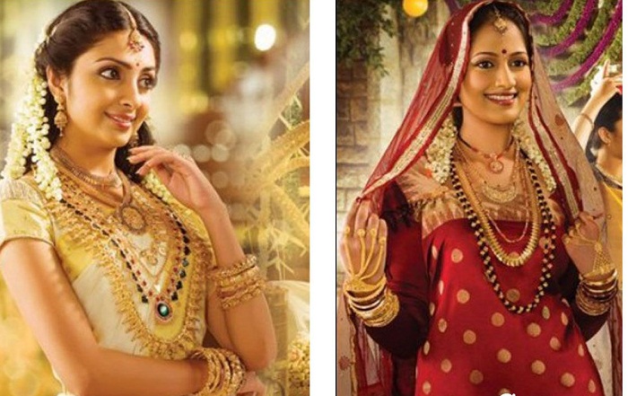 अन्य साउथ इंडियन ब्राइड्स की तरह मलयाली दुल्हनें भी एक साधारण जीवन शैली होने के बावजूद मेटल ज्वेलरी पहनती है। शादी के दिन उन्हें व्हाइट सिल्क सुनहरे बॉर्डर वाली साड़ी पहनाई जाती है। वे अपने आउटफिट के साथ फ्लोरल ज्वैलरी पहनना पसंद करती हैं, जिसमें गजरा, नेकलेस और ब्रेसलेट शामिल हैं जो व्हाइट और ऑरेंज रजनीगंधा(जैस्मीन के फूल) से बनी होती हैं।