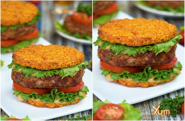 10. बेक्ड गाजर टिक्की को एक बोर्ड पर रखें और उस पर थोड़ा सा तैयार सॉस फैलाएं। लेट्यूस, टमाटर के स्लाइस, तली हुई बीन टिक्की रखें और टिक्की पर और सॉस फैलाएं। और लेट्यूस डालें और एक और गाजर टिक्की से ढक दें।