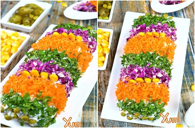 3. सेट होने के बाद ऊपर थोड़ा मेयोनेज़ लगाएं। हरा धनिया, बैंगनी गोभी, गाजर, अचार वाली हरी मटर और उबली स्वीट कॉर्न से गार्निश करें।