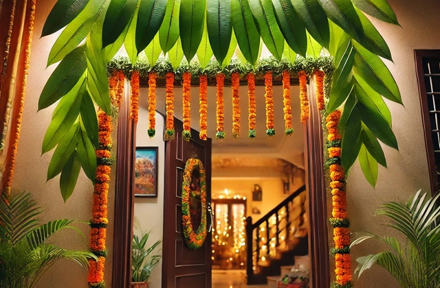 तोरण लगाने की परंपरा सदियों पुरानी है। यह भारतीय संस्कृति में शुभ अवसरों पर अपनाई जाने वाली प्रथा है, जो त्योहार की पवित्रता और धार्मिक श्रद्धा को दर्शाती है।