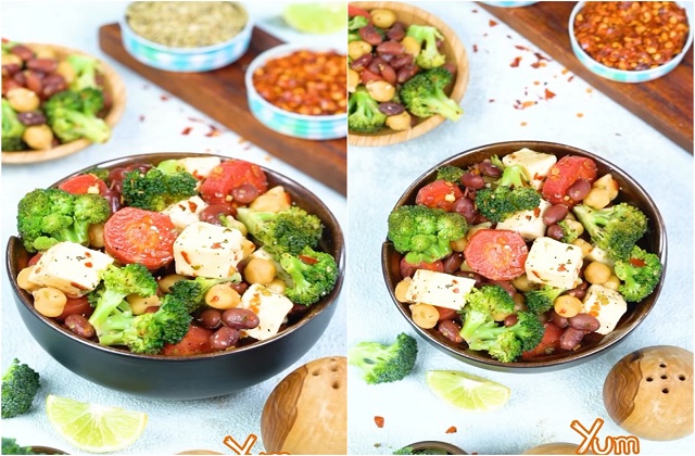 1. एक बड़े बाउल में सभी उबली हुई सब्जियां, चने, राजमा और पनीर डालें।