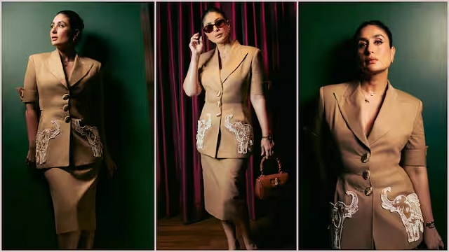 करीना ने ब्राउन स्कर्ट के साथ मैचिंग ब्राउन ब्लेज़र पहना, जिस पर बड़े गोल्डन बटन और एलीफेंट डिजाइन बने हुए थे। उन्होंने अपने लुक को मिनिमल रखते हुए ब्लेज़र की स्लीव्स रोल की हुई थी और हाथ में एक स्टेटमेंट वॉच कैरी की। स्लीक बन हेयरस्टाइल और सनग्लासेज ने उनके लुक को और भी ग्रेसफुल और पावरफुल बना दिया।