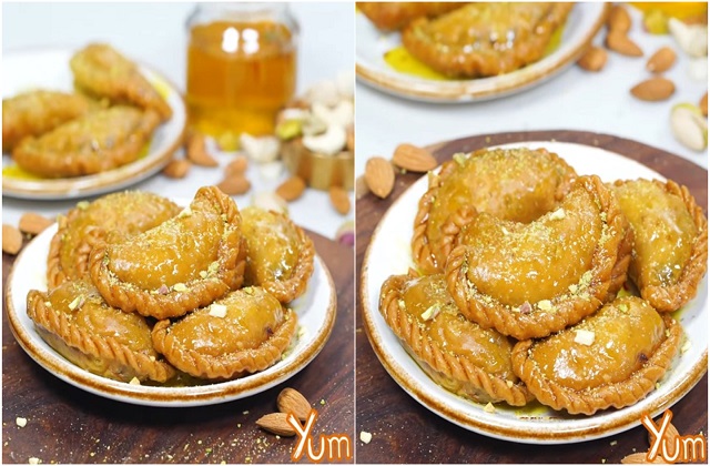 23. तली हुई गुजिया को तैयार चीनी के सिरप में 2-5 मिनट तक भिगोएँ।