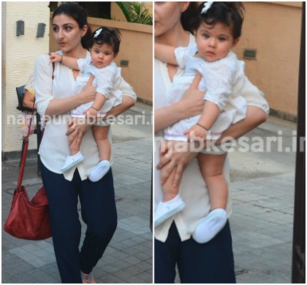 हाल में ही सोहा अली खान बेटी इनाया नौमी खेमु के साथ स्पॉट की गई। मॉम सोहा की बाहों में इनाया बहुत ही क्यूट लग रही थी। इस दौरान सोहा ने व्हाइट शर्ट के साथ ब्लैक जीन्स वियर की थी और साथ में फ्लैट फुटवियर पहने थे। इसी के साथ उन्होंने डार्क कलर का हैंडबैग कैरी किया था। वहीं, इनाया ने व्हाइट आउटफिट वियर किया था जिसके साथ मैंचिग व्हाइट शूज कैरी किए।