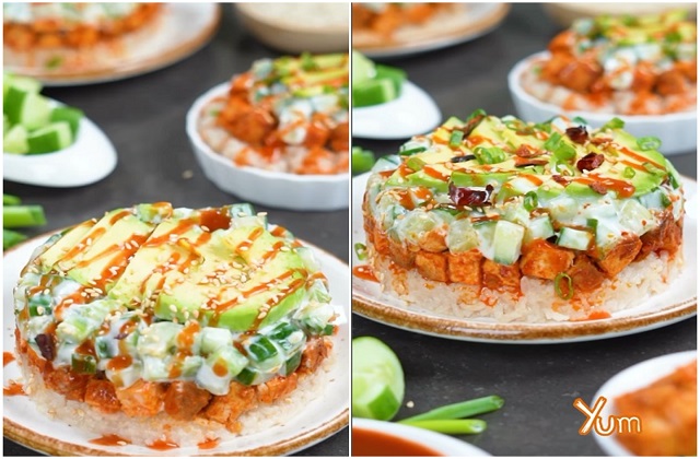 9. एक गहरे बर्तन में पहले एवोकाडो की लेयर लगाएं, फिर खीरा–मेयो मिक्स, उसके बाद टोफू मिक्स और सबसे ऊपर चावल का मिश्रण डालें। इसे चम्मच से हल्के से दबाएं।
